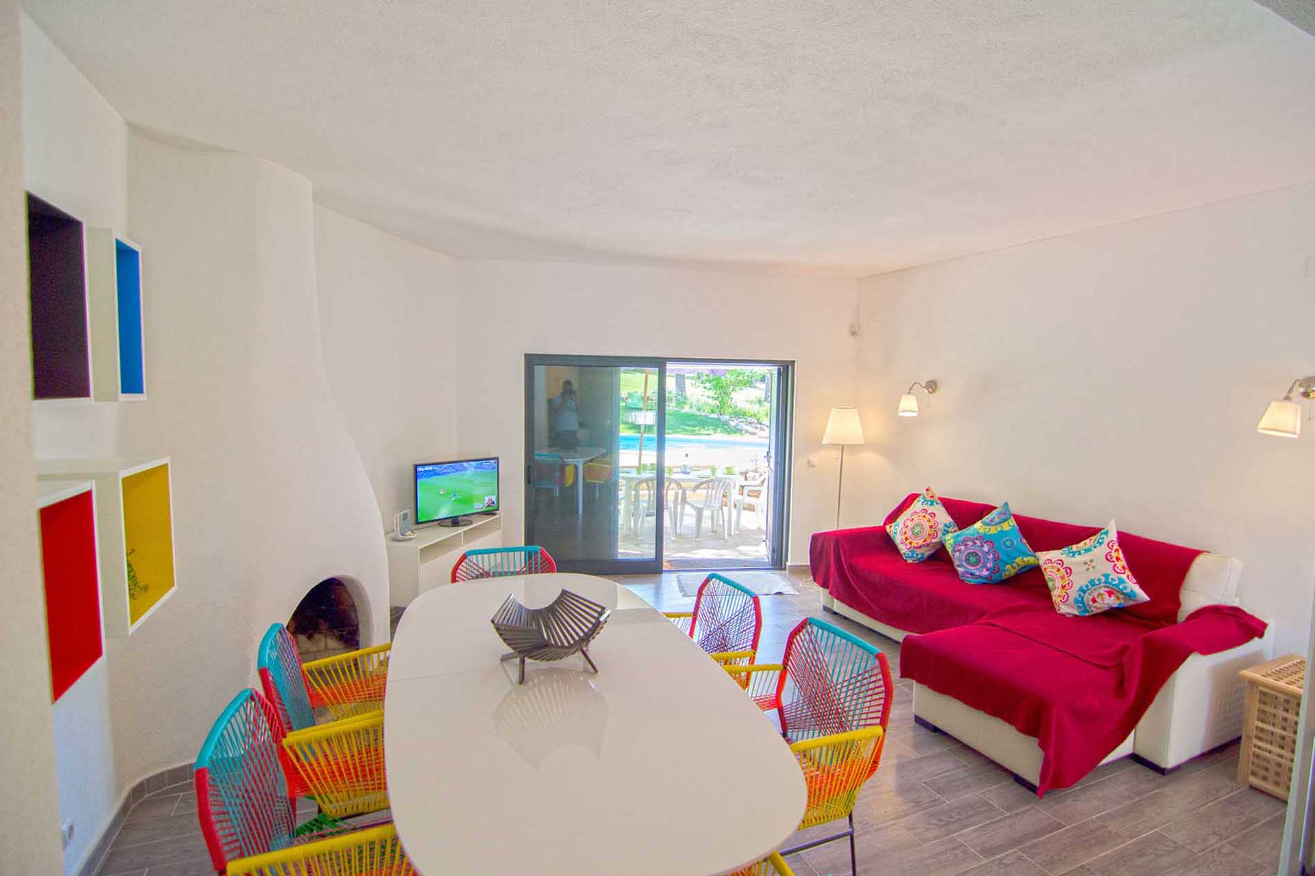 The leisure and dining area, unites in a single space, with table and 6 chairs, the living room has 1 sofa bed with a chaise-long. It also has a fireplace, TV unit and TV.