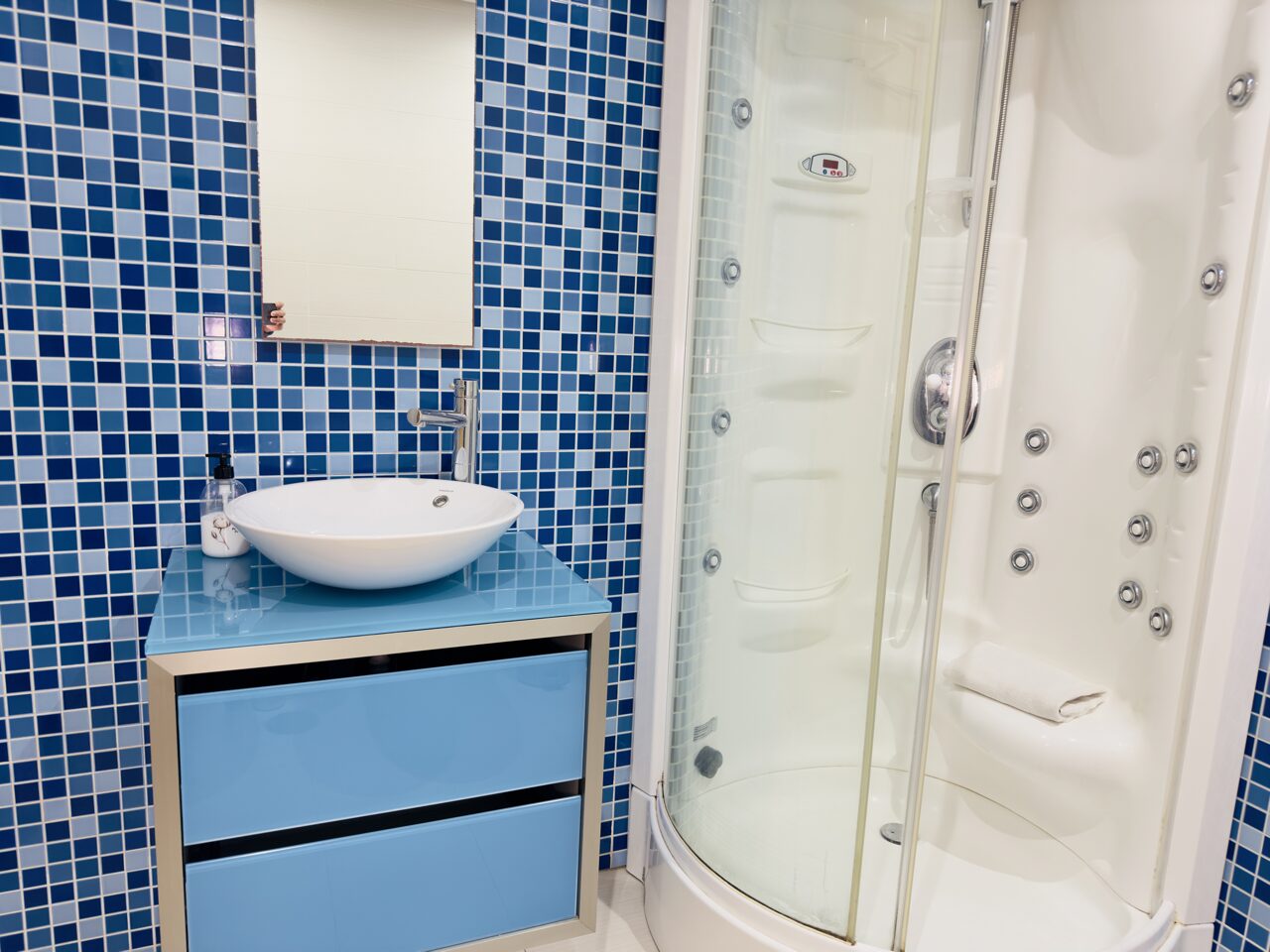 The bathroom features convenient amenities such as a hairdryer, iron, and ironing board. Guests also have access to the complex’s stunning garden and pool area, perfect for relaxation and enjoyment.