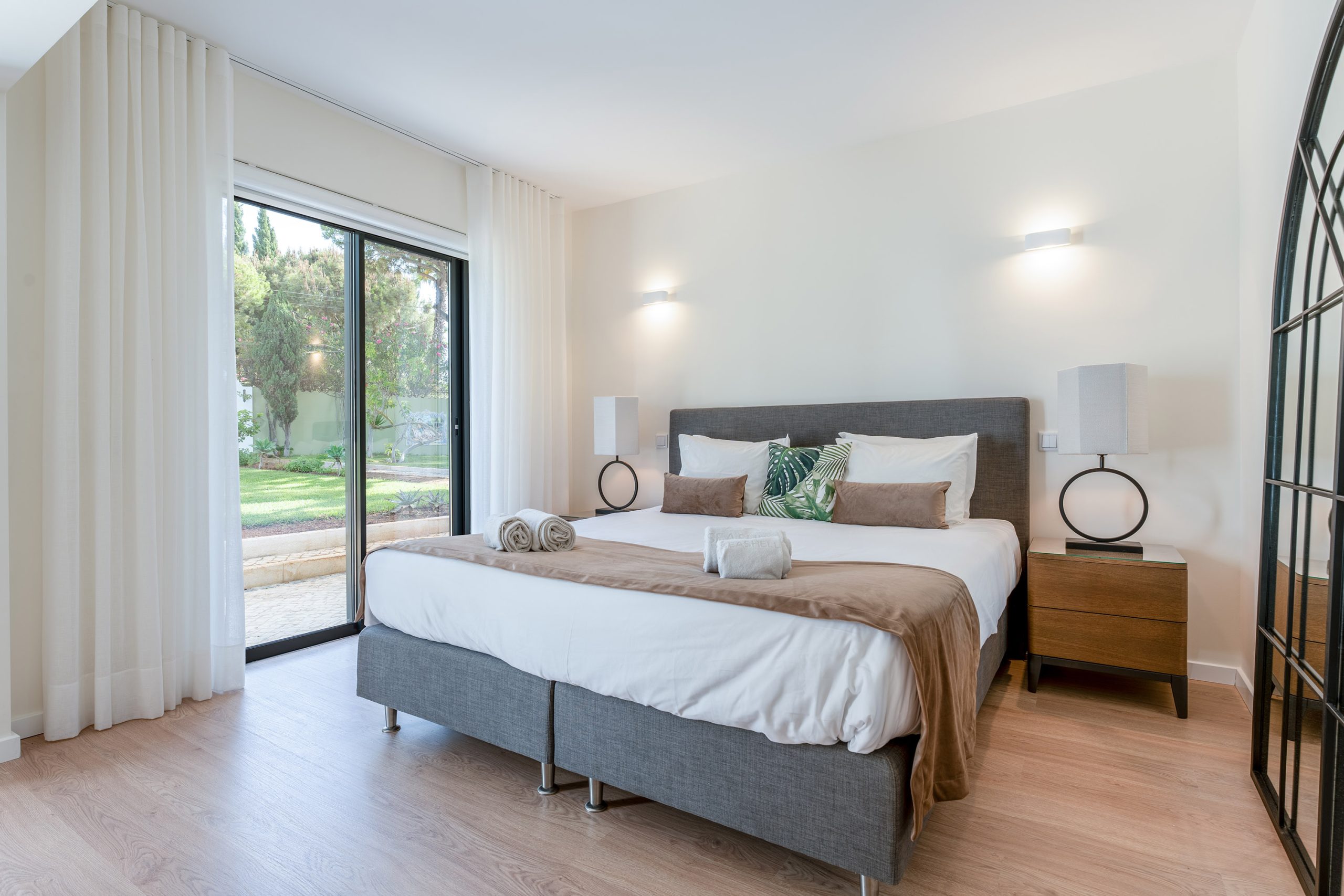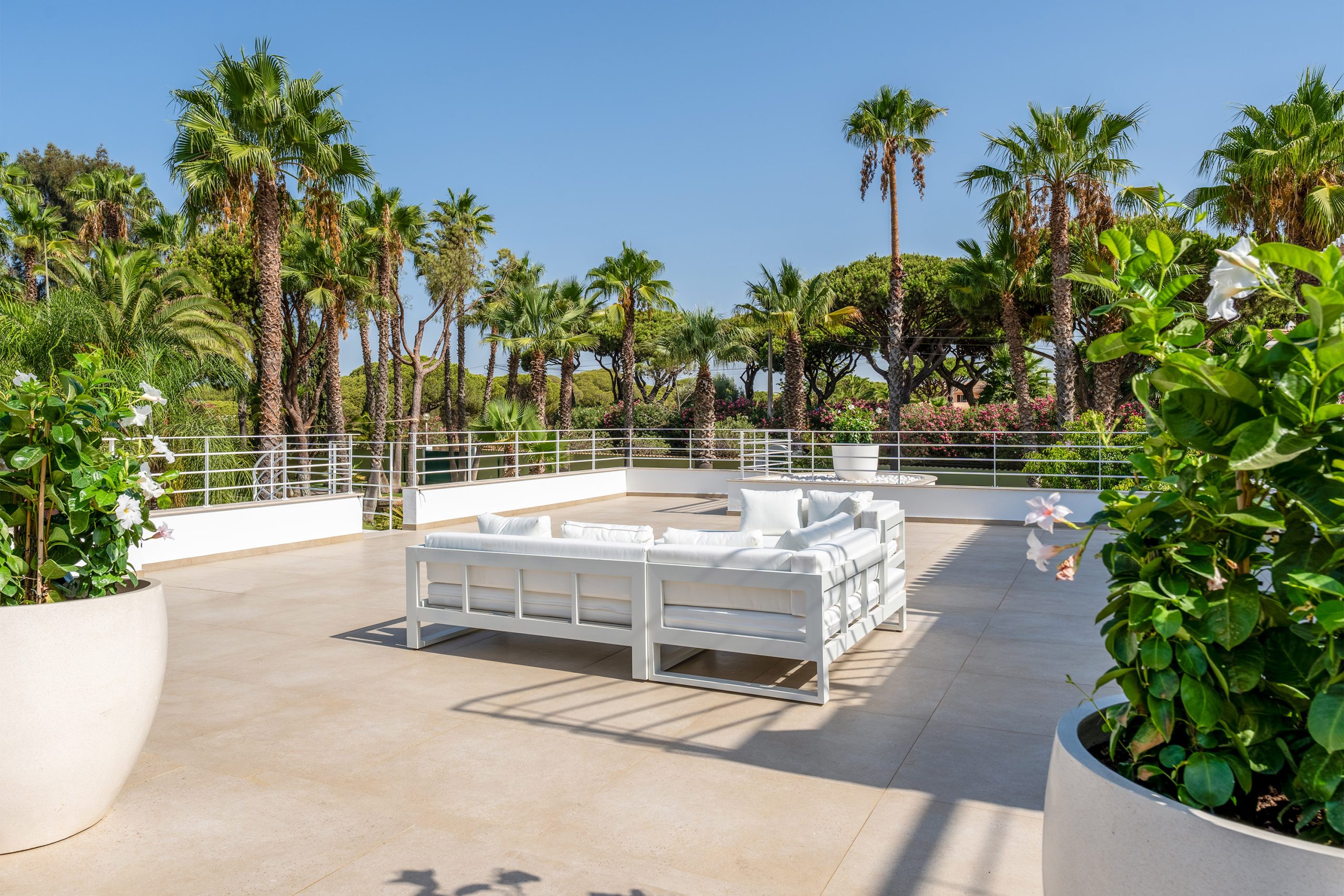 O exterior é magnífico, as inúmeras palmeiras e os hectares de relva contribuem para o sentimento tropical do jardim, aliado a uma grande piscina de 12 metros de comprimento por 6 metros de largura e profundidades entre 1 metro e 2,2 metros e pelo menos 12 espreguiçadeiras ao lado. A estrutura de aspecto natural próxima proporcionará uma sombra fresca nos dias quentes de verão.